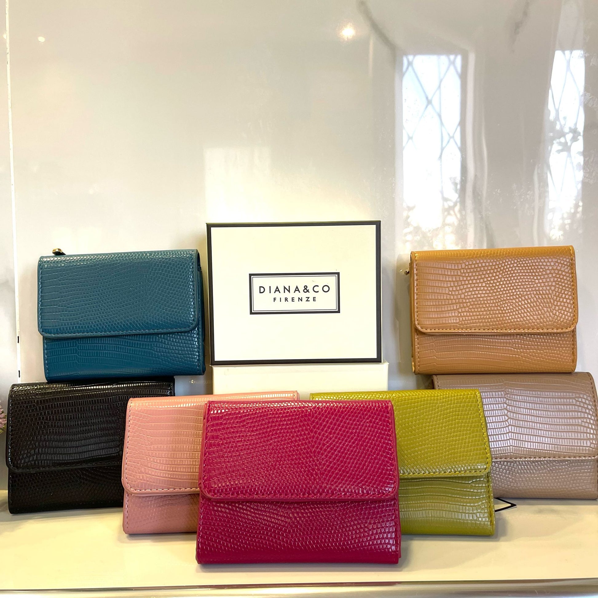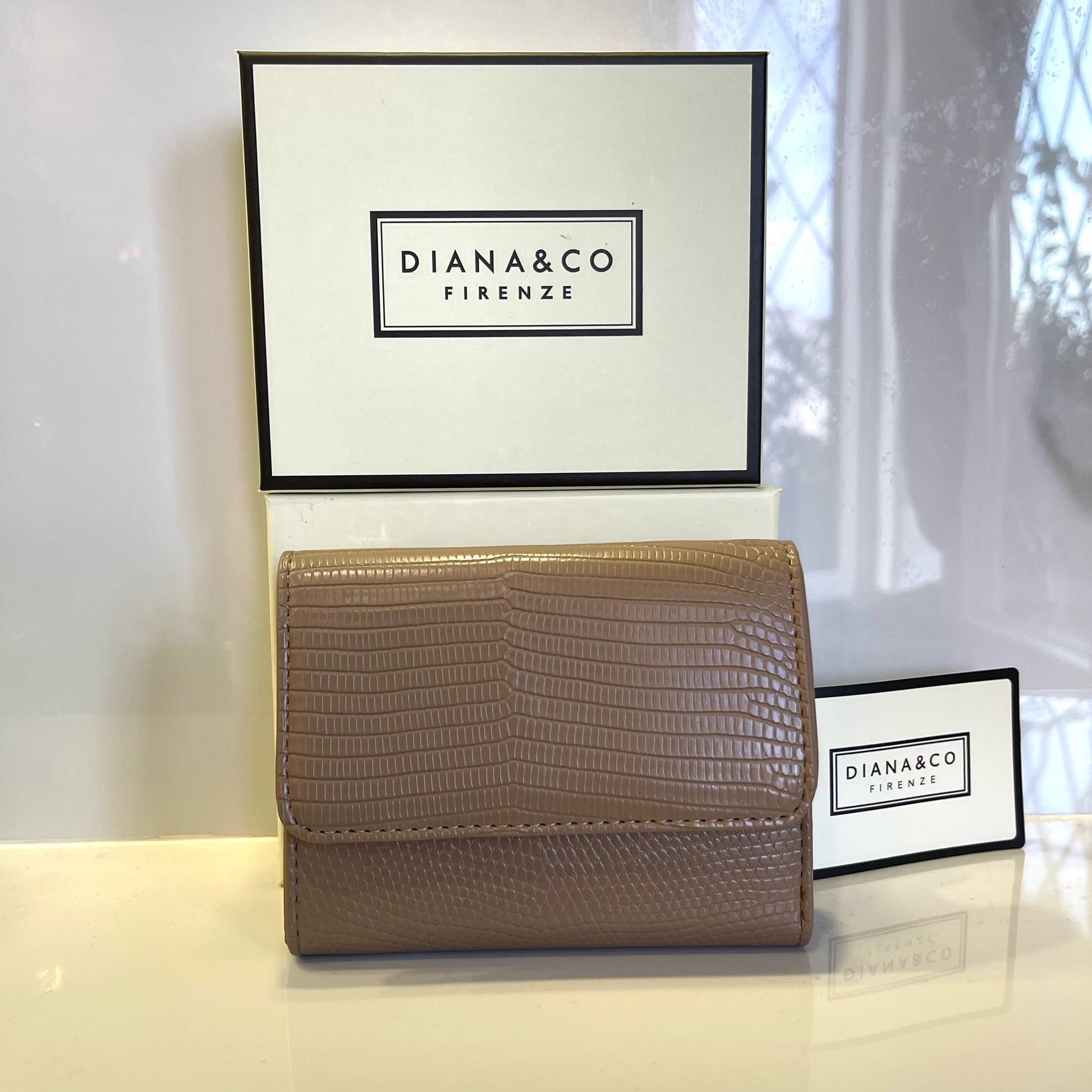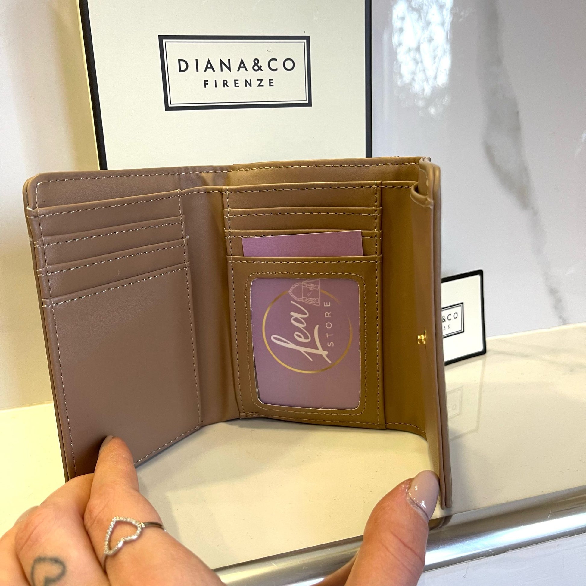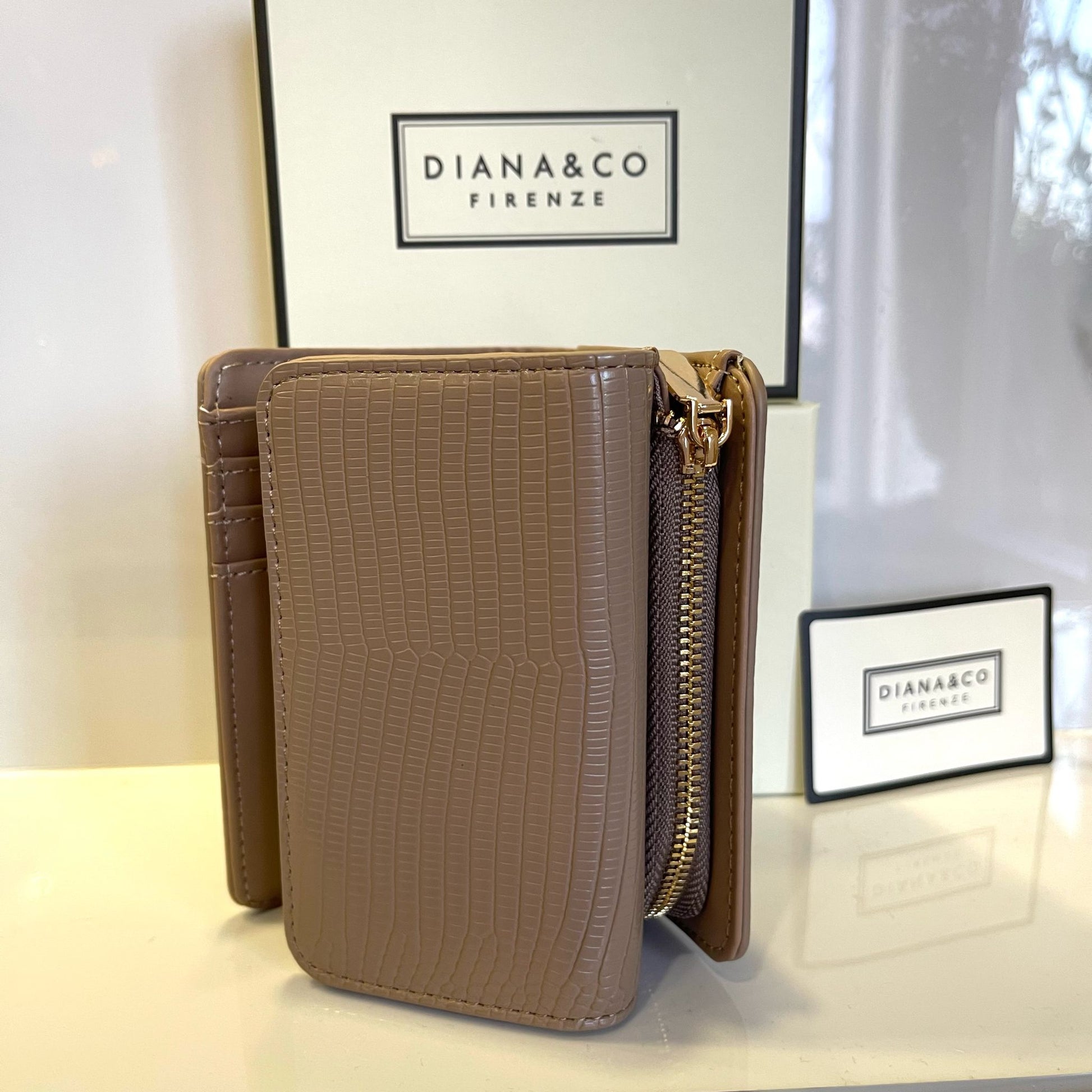 Portafoglio Diana&Co Firenze con doppia apertura a pattina e zip. Dettagli in gold